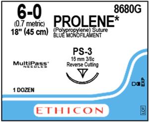 1 DZ/BX^ Suture Prolene Polypropylene 6-0. 18"~45cm. Blue Monofilament. Needle Size: P-3 16mm 3/8 Circle. Non-Absorbable. Precision Point-Reverse Cutting Prime. 1 DZ/BX