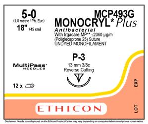 1 DZ/BX^ Suture Monocryl Plus Antibacterial (poliglecaprone 25) 5-0. 18"~45cm. Undyed Monofilament. Needle Size: P-3 13mm 3/8 Circle. Multpass Needles. Absorbable Suture. 1 DZ/BX