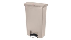 The Rubbermaid Commercial Slim Jim Front Step-On Container has a small footprint and offers increased pedal clearance for easy foot access and hands-free waste disposal. A tight-fitting lid has a controlled close to reduce noise and an internal hinge design to prevent wall damage. Offering easy maintenance, this step-on container features a liner retainer band to securely hold liner bags.